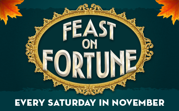Every Saturday in November! Drawings at 7pm, 8pm, 9pm and 10pmWe hope you’re hungry, because it’s time to Feast on Fortune! Join us each Saturday in November for the chance to fill your plate with a share of $20,000 in cash!