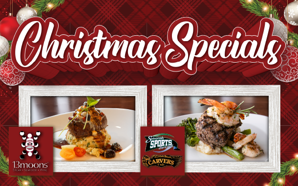 Craving a taste of the sea with your meat? Visit Carver’s Café or Swinomish Sports Bar & Grill between 1pm and 10pm for Surf & Turf! Sink your teeth into an 8-ounce filet mignon topped with cowboy butter and three butterflied prawns. Accompanied by roasted garlic mashed potatoes, chef’s choice vegetables, side salad, and a slice of chocolate cake, this splashy Christmas feast can be yours for just $49.99!