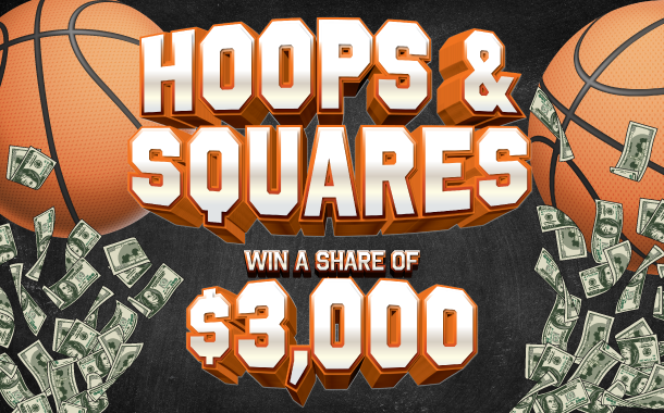 Ready to make baskets of cash during college basketball season? Dribble on in for Hoops & Squares! Between March 15 and 29, place a bet of at least $50 on any game at the BetRivers at Swinomish Sportsbook to receive an entry into the drawing for placement on the board. Every $50 bet grants an additional entry, so keep shooting your shot and placing wagers!