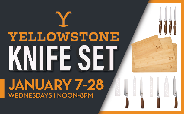 Every Wednesday in January from Noon to 8pmSlice into the new year with the Yellowstone Knife Set! Our latest Signature Collection offers top-tier kitchen tools emblazoned with the logo from the hit TV series. Enjoy preparing your favorite meals with a santoku, slicing knife, chef knife, and bread knife, and devour your delicious creations with a 4-piece steak knife set. Don’t forget the 3-piece wooden cutting board set!
