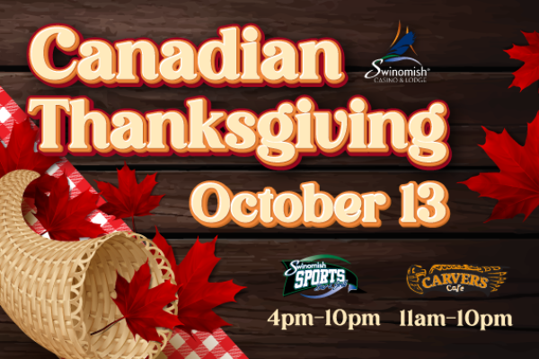 Get ready to celebrate Canadian Thanksgiving with us on October 13! We’re honoring our northern neighbors with three delectable dining specials. Stop by Carver’s Café between 11am and 10pm or Swinomish Sports Bar & Grill between 4pm and 10pm for a taste!